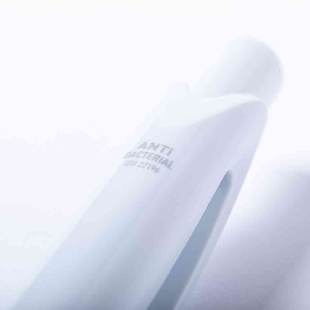 Bolígrafo antibacteriano de mecanismo pulsador. Diseño monocromático y cuerpo de suave acabado, con original clip curvado, especialmente diseñado para marcaje en tampografía. Tinta azul.